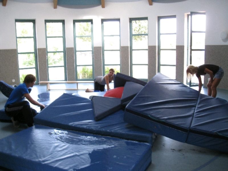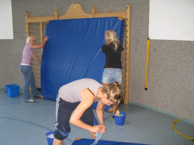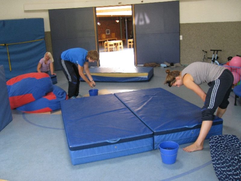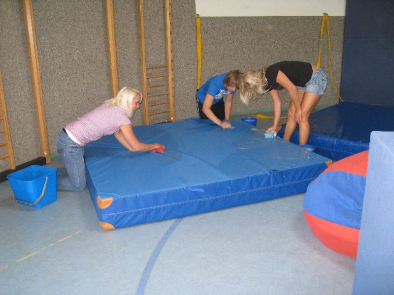 Reinigung der Sportgeräte im Kindergarten Sarah, Marten, Jasmin und Annika trafen sich im Bewegungsraum des Kindergartens Coldewei zur Säuberung der Turnmatten und der Fahrzeuge