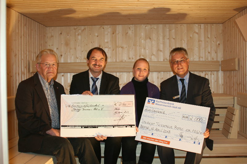Am 12.04.2013 besuchten Ralf Mertens, Inhaber der Firma Fischer & Plath sowie Michael Ziffer von der Raiffeisenbank Wesermarsch Süd den Stedinger Turnverein. Der Anlass war ein sehr freudiger, denn im Gepäck hatten sie großzügige Geldspenden über 2500€ und 2000€. Mit dem Geld kann ein beträchtlicher Teil der Anschaffungskosten der neuen Sauna aufgefangen werden.